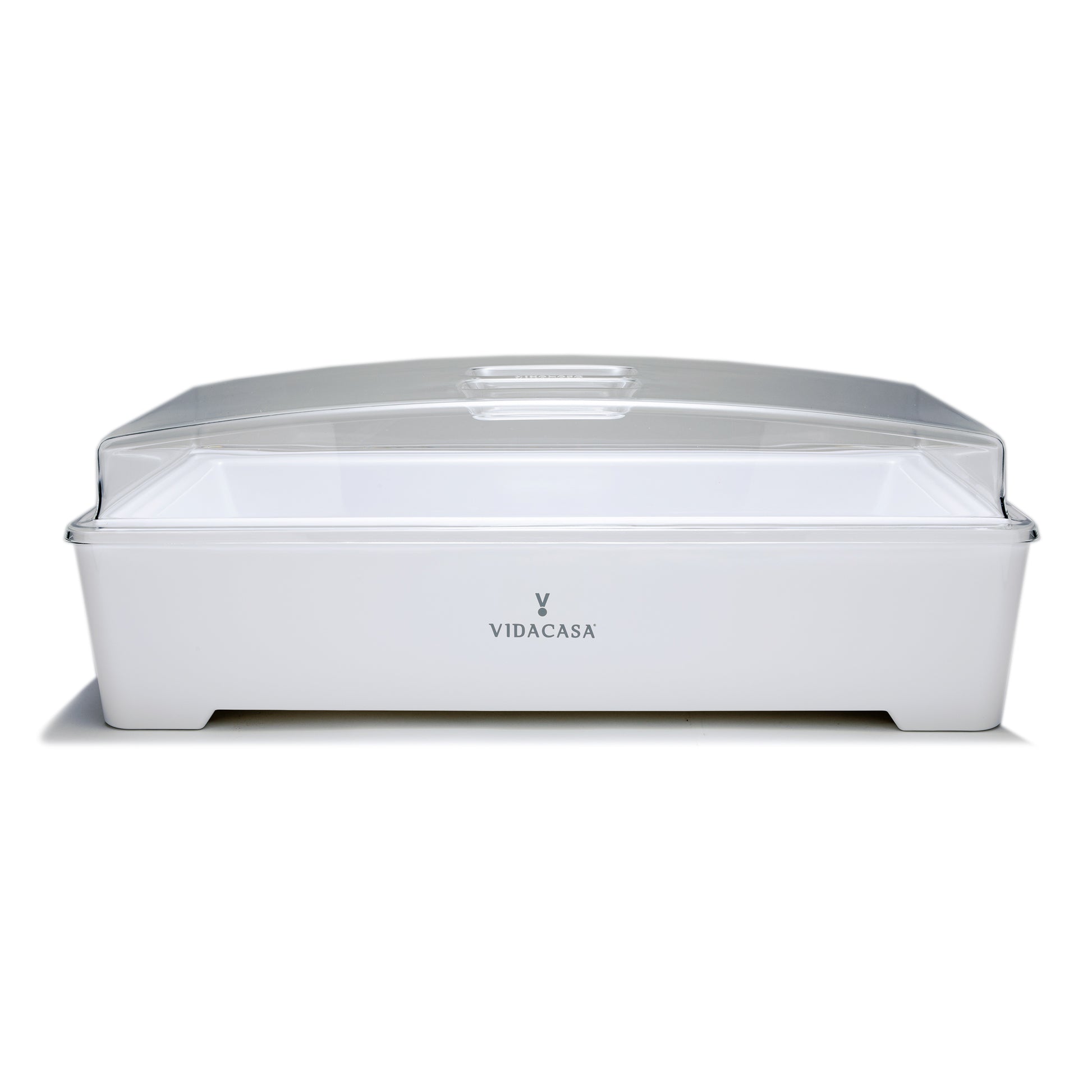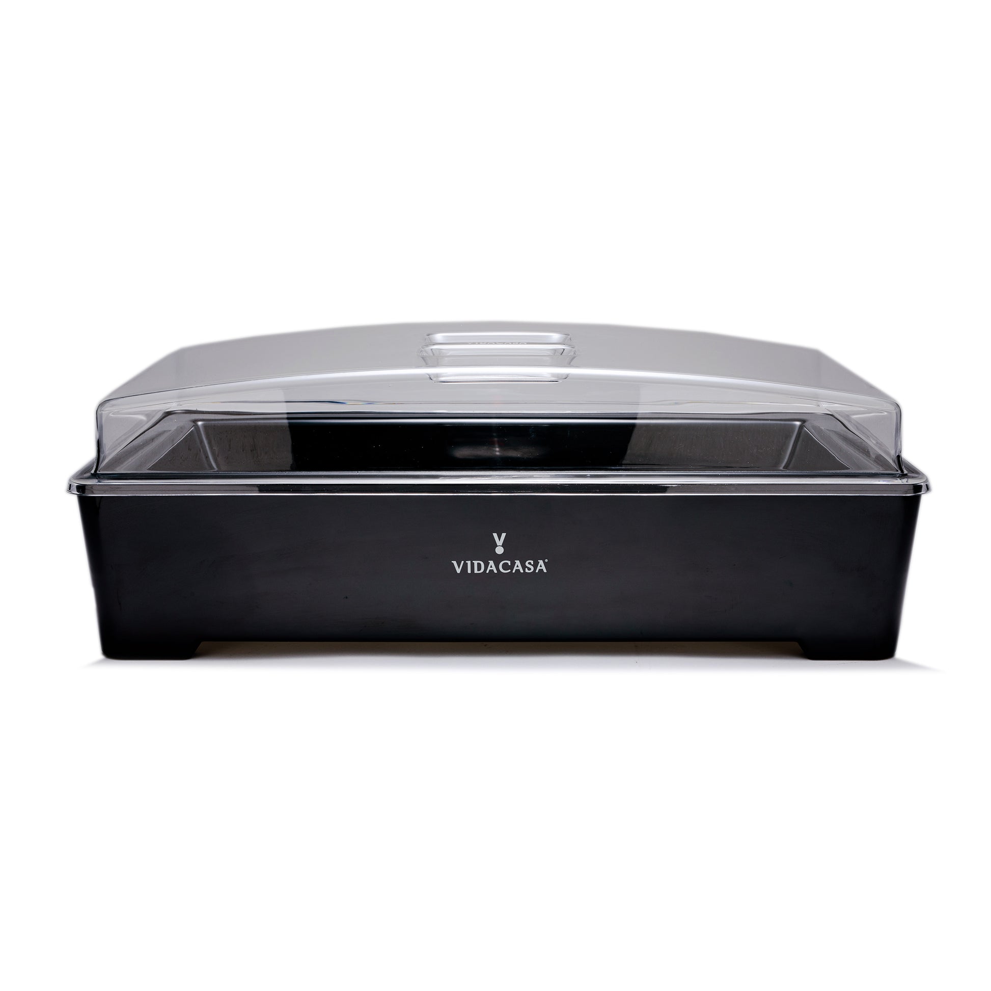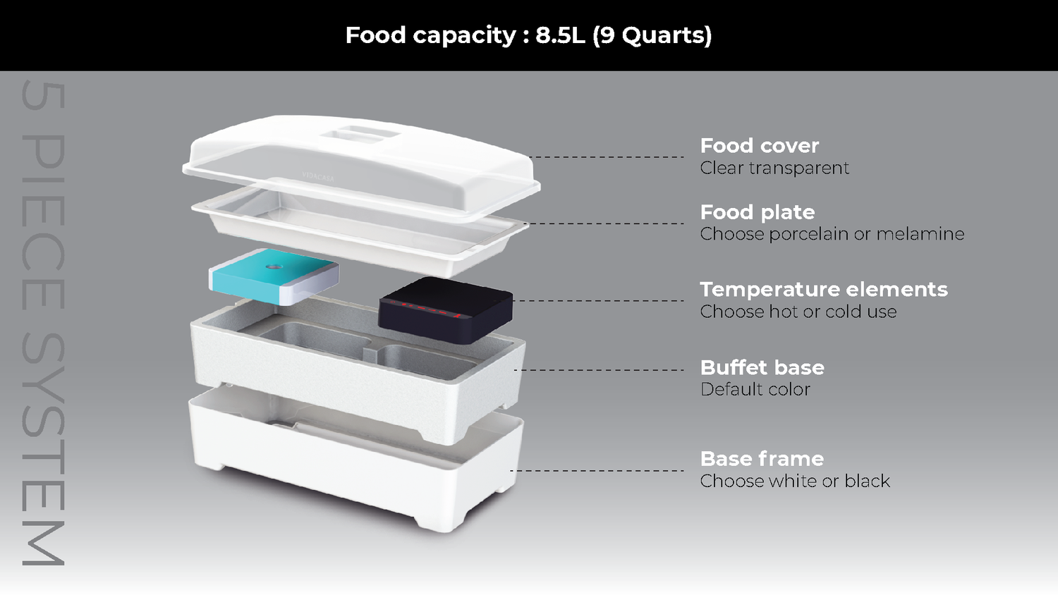 The Vidacasa® Classic series buffet equipment set is the first to offer both chilling and warming functions on the same piece of buffet equipment, without the need of wet ice for cooling or chafing fuel for warming. Depending on the buffet food options, the complete buffet ware stays wireless, portable, and adjustable in cooling and warming.